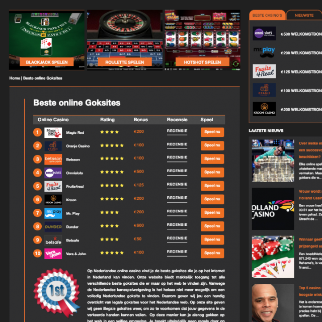 Er zijn veel Nederlandse websites die geen zelf casino’s aanbieden, maar jou wel adviseren waar je veilig en betrouwbaar kunt gokken. Zo’n goksite is nederlandseonlinecasino.nl bijvoorbeeld. Hier vind je alleen maar de beste online goksites die allemaal zijn beoordeeld op een aantal criteria. Deze goksites zijn veilig, betrouwbaar en ze beschikken allemaal over een legale kansspelvergunning. Weliswaar nog niet van Nederland, maar wel van andere gerenommeerde landen zoals die van Groot-Brittannië en Malta. Ga niet zomaar zelf goksites zoeken. want dan loop je het risico om te gaan spelen in een onbetrouwbaar casino. Alleen de casino’s die je vindt op Nederlandse Online Casino, zijn 100% veilig en betrouwbaar bevonden.