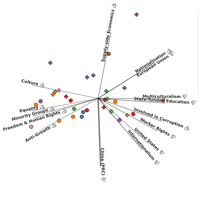 Elk van die personen voorzagen de onderzoekers nog van tags met categorieën uit het Manifesto Project (https://manifesto-project.wzb.eu). Die categorieën zijn oorspronkelijk bedoeld voor politieke manifesten, maar met wat aanpassingen werden ze nu gebruikt voor politieke personen. Met 61 unieke tags werd zo elke persoon gekoppeld aan een positief of negatief sentiment ten opzichte van specifieke ideologieën of ideeën in het algemeen, zoals de Europese Unie of multiculturalisme.
