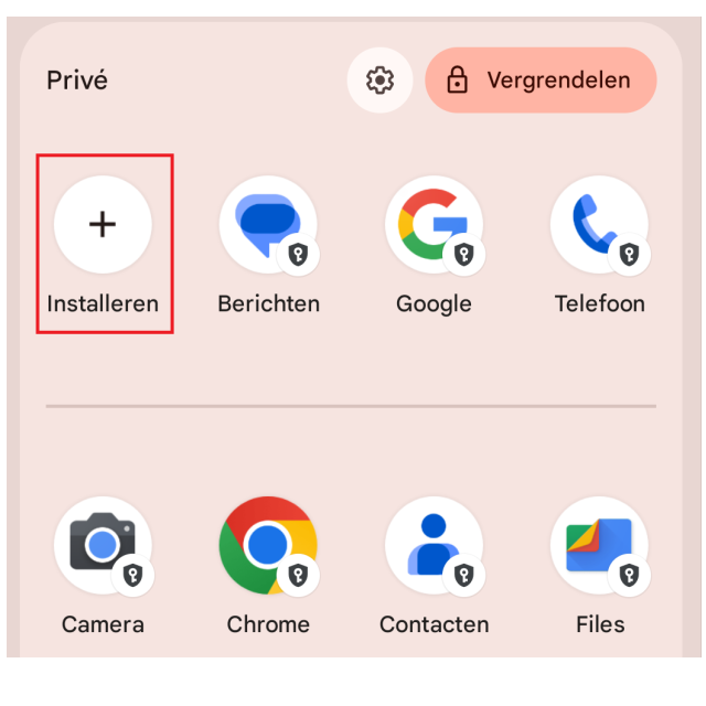 Ook kun je apps direct in het privégedeelte installeren door eerst het privégedeelte te openen en vervolgens op Installeren te drukken. Als je dat doet, opent het direct de Google Play store en kun je apps direct in het privégedeelte installeren.