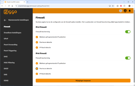Het is belangrijk dat de firewall van de router is ingeschakeld. Ziggo-abonnees navigeren in het beheerpaneel van hun router achtereenvolgens naar Geavanceerde Instellingen / Firewall. Check vervolgens of de schuifjes achter IPv4 firewall en IPv6 firewall zijn ingeschakeld. Dit onderdeel controleert het inkomende en uitgaande netwerkverkeer op verdachte zaken. Een firewall kan een mogelijke cyberaanval blokkeren. Verder vind je op de firewallpagina vermoedelijk nog meer opties. Zo kunnen klanten van Ziggo de onderdelen Blokkeer gefragmenteerde IP-pakketten, Poortscan detectie en IP-flood-detectie activeren. We nemen deze opties met je door. Hackers proberen veelal via openstaande poorten op een netwerk in te breken. Verklein het risico door de poortscan detectie-optie (of een soortgelijke benaming) van de firewall te activeren. Bij verdachte scanpraktijken blokkeert de router de verbinding. Daarnaast is het gebruik van gefragmenteerde IP-pakketjes een bekende techniek om een firewall te omzeilen, maar de betere routers kunnen deze kleine datapakketjes tegenhouden. Tot slot sturen sommige hackers een enorme hoeveelheid IP-pakketten op de router af. Het doel hiervan is om de boel te ontregelen of overbelasten. Een mogelijk gevolg daarvan is dat smarthome-apparaten niet meer goed werken. Activeer in de firewallinstellingen indien mogelijk de optie IP-flood-detectie om zo’n aanval af te wenden.
