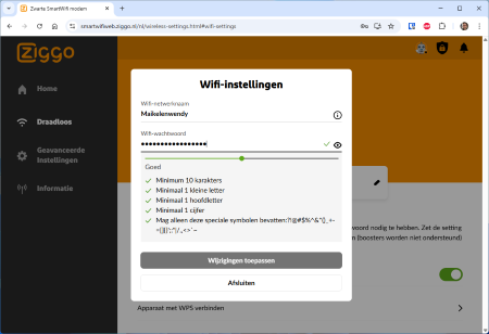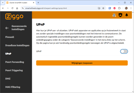 Vermoedelijk is er al een beveiligd wifi-netwerk op jouw router ingesteld. Het is zinvol om het standaardwachtwoord van de internetprovider te vervangen voor een eigen sterk wachtwoord. Dat kan in de draadloze instellingen. Ga op een Ziggo-router naar Draadloos en klik achter het huidige wachtwoord op het potloodpictogram. Klik in het nieuwe venster nogmaals op het potlood en typ een vers wachtwoord. Je ziet ook aan welke voorwaarden het wachtwoord moet voldoen, zoals minimaal tien tekens en het gebruik van een cijfer. Bevestig met Wijzigingen toepassen. Vrijwel alle routers ondersteunen tegenwoordig UPnP (Universal Plug and Play). Dankzij deze functie openen apparaten binnen het netwerk automatisch bepaalde netwerkpoorten. Een beveiligingscamera zet bijvoorbeeld netwerkpoort 8080 open, waarna je overal ter wereld livebeelden kunt bekijken. Deze functie voorkomt dat je eigenhandig instellingen moet veranderen. In sommige situaties is dat handig, maar deze techniek biedt ook kansen voor hackers. Een nadeel is dat UPnP apparaten blindelings vertrouwt. Je kunt de functie in de routerinstellingen voor de zekerheid uitzetten. Navigeer op een router van Ziggo naar Geavanceerde instellingen / UPnP en deactiveer de schuifregelaar achter UPnP. Sluit af met Wijzigingen toepassen. Tot slot verschijnt er wellicht voor jouw router regelmatig een software-update. Het is belangrijk om die altijd te installeren, want fabrikanten verhelpen via deze weg geregeld veiligheidslekken. Overigens voeren bijna alle recente routers automatisch updates uit.
